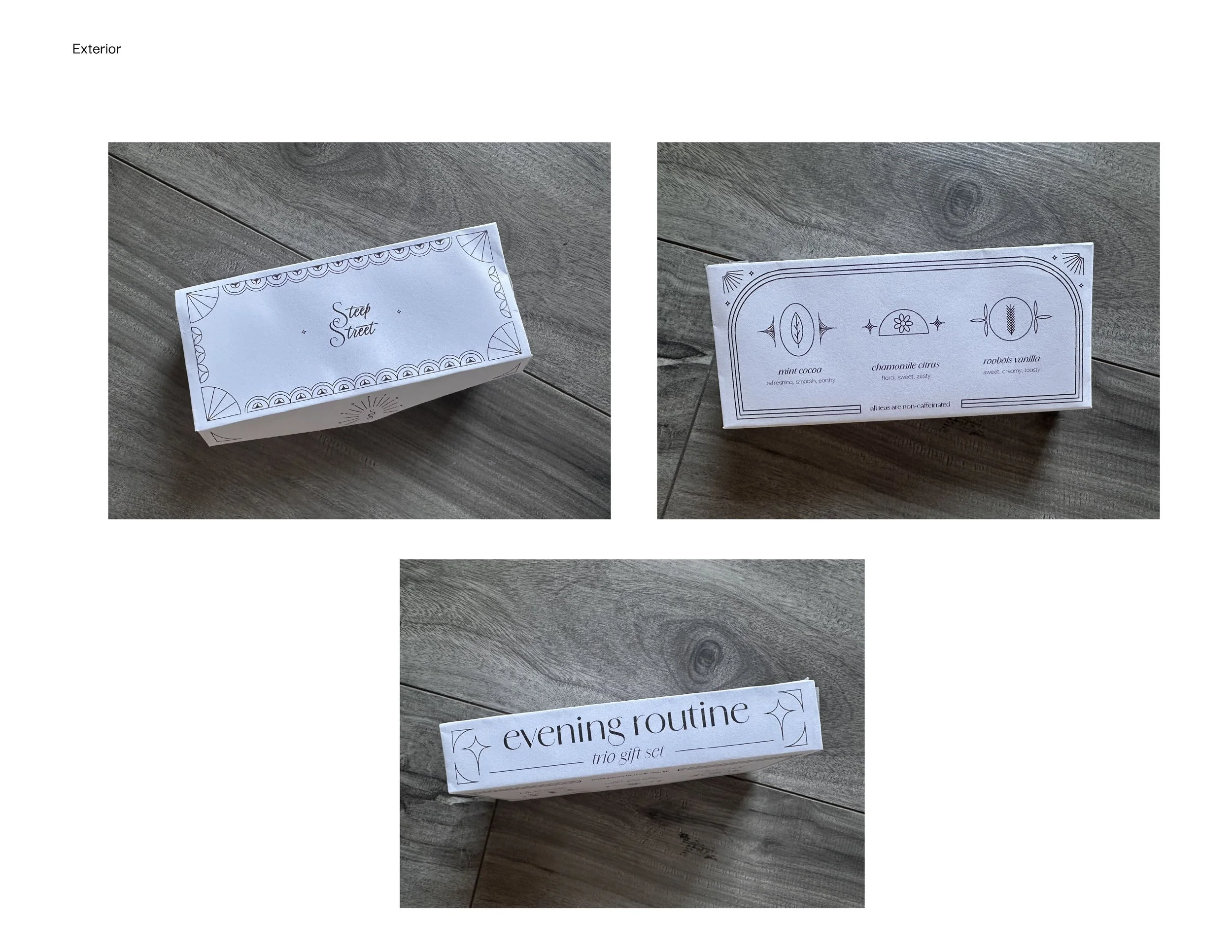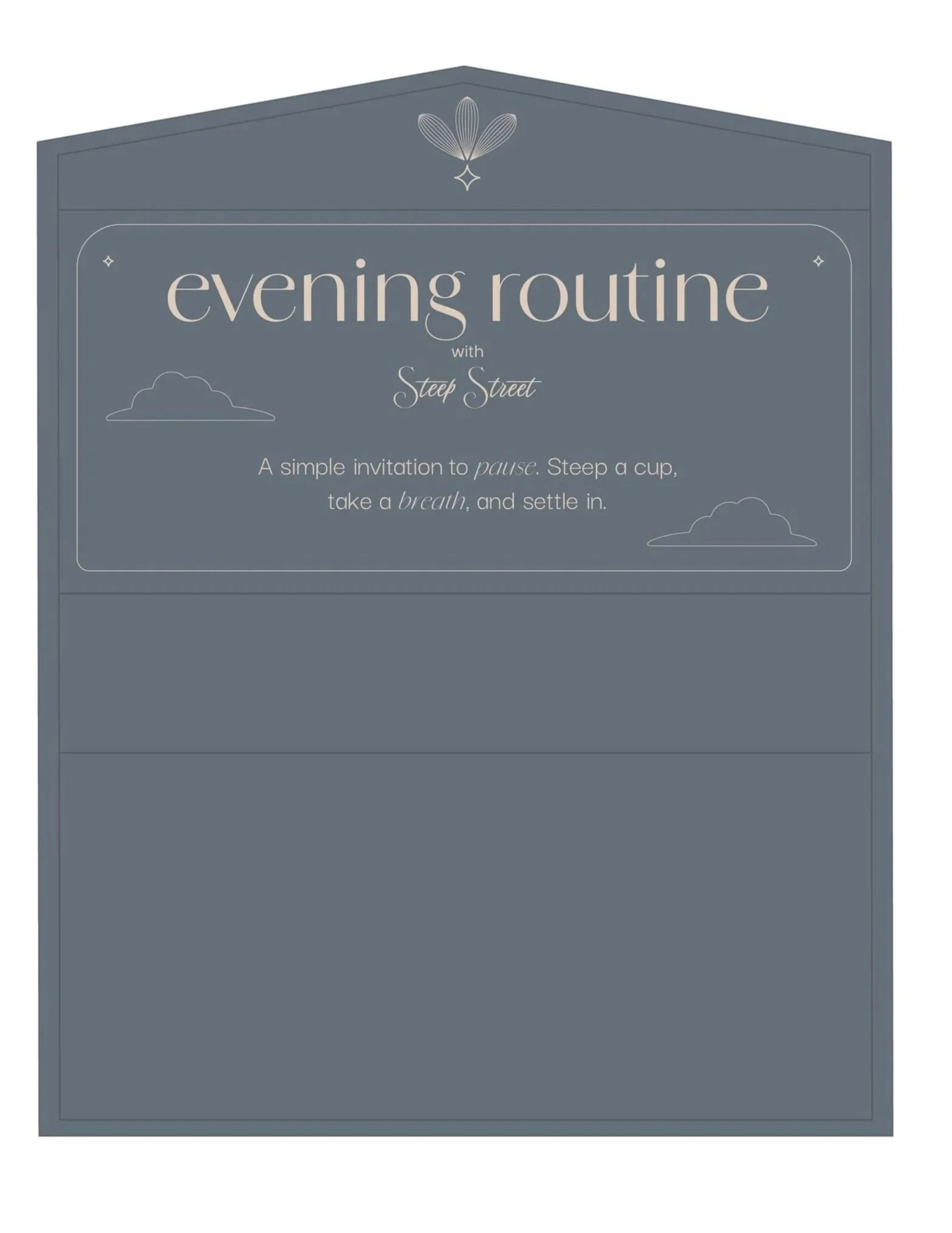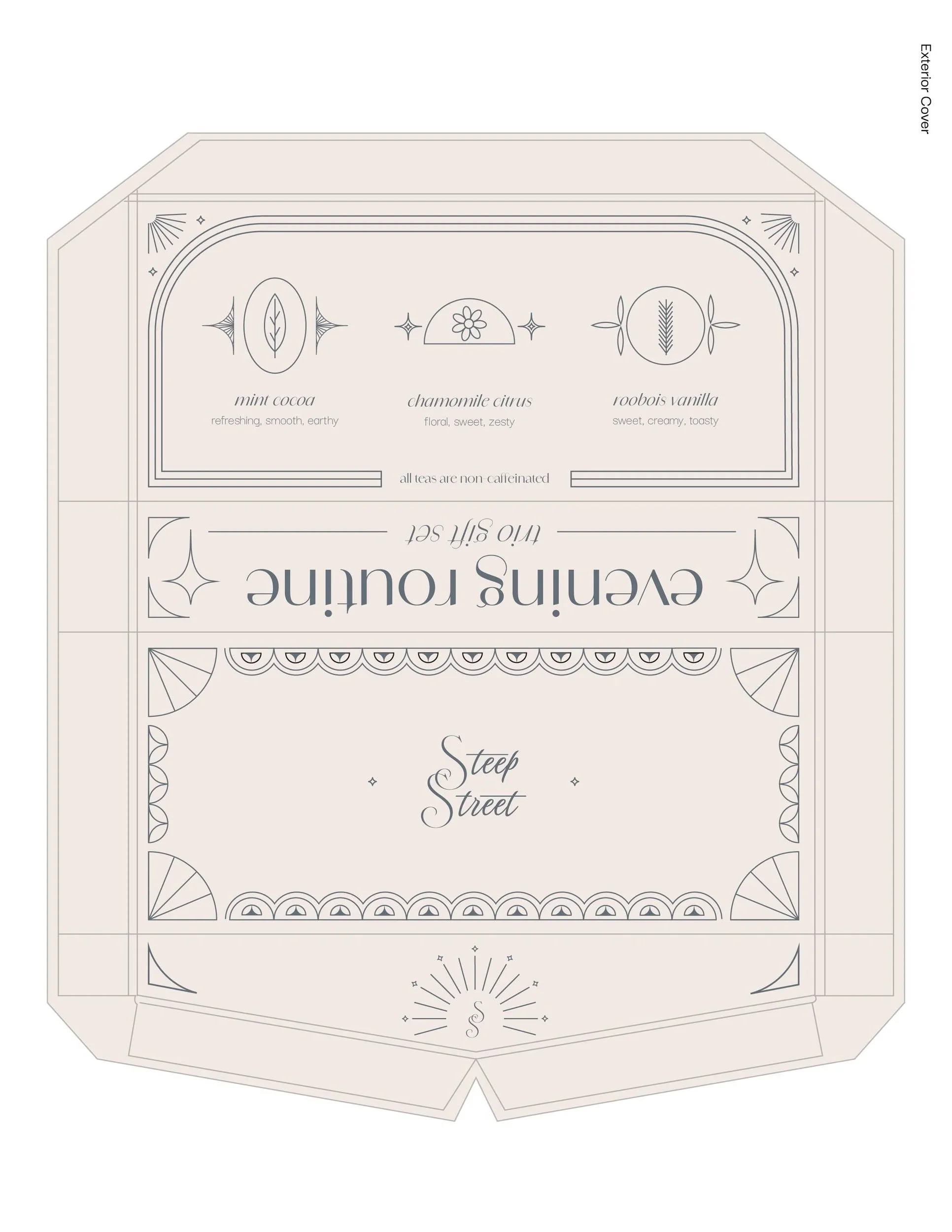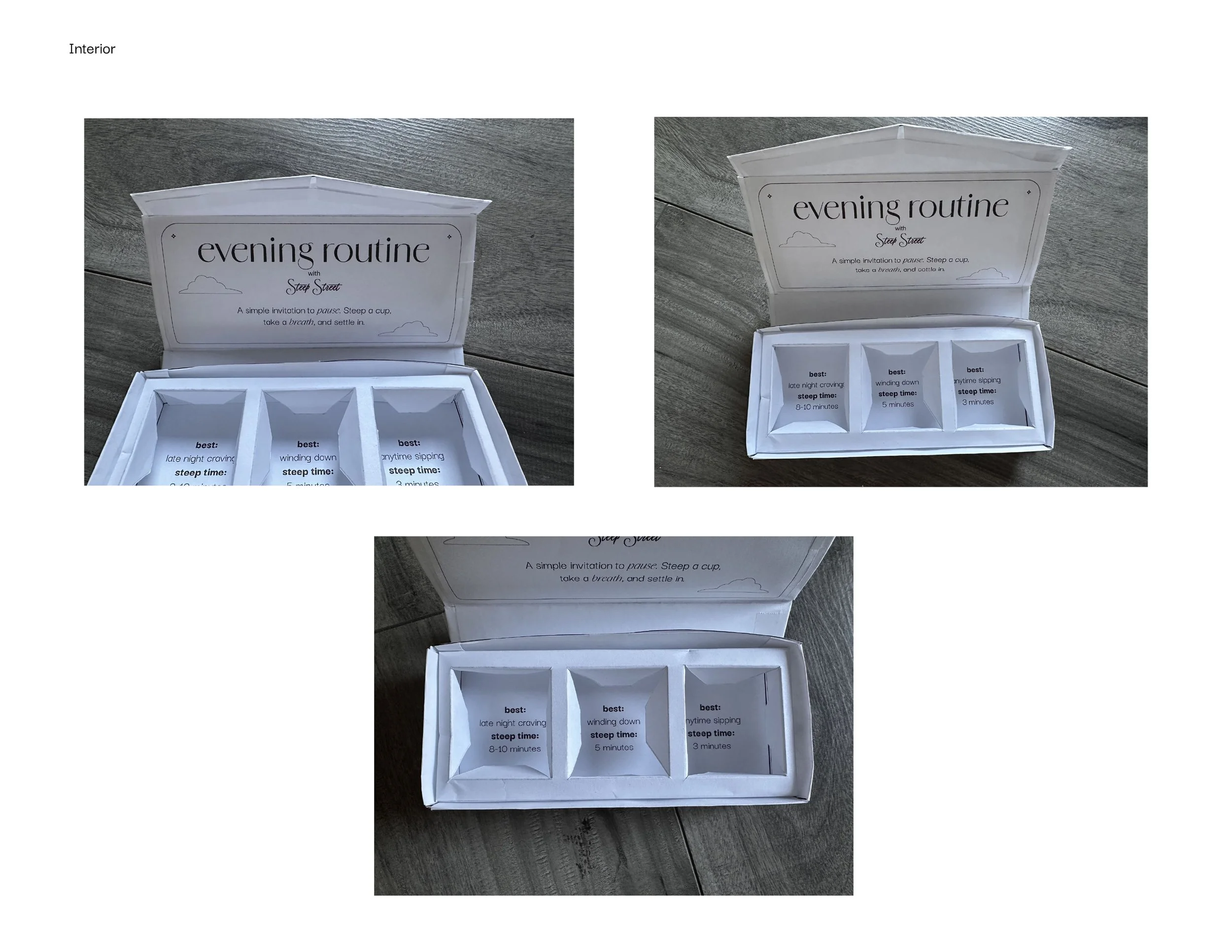 You must create a brand logo and packaging for the “Evening Routine” sampler, which includes three mini tins: Chamomile Citrus, Mint Cocoa, and Rooibos Vanilla. All three are arranged together inside one compact retail package. Your packaging system must show the sampler name, list the three blends, note whether each is caffeine free, and leave space for basic steeping instructions. The client wants the design to feel calm and inviting, with clear type hierarchy between the brand, sampler name, and flavors.